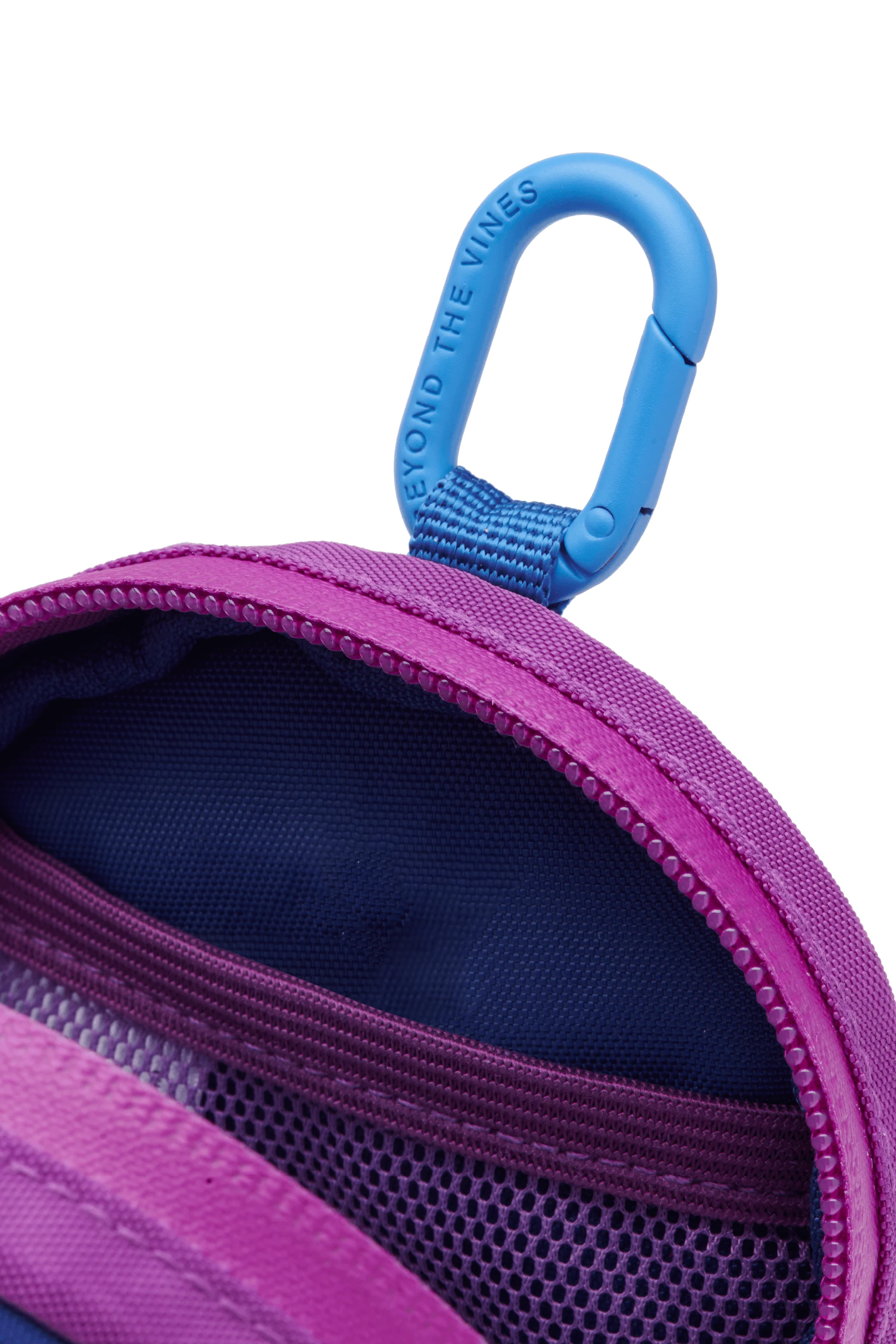 Perfect for clipping onto your bags or clothing for extra storage and easier access to your smaller items, this contrast round pouch features a waterproof zipper and inner pockets. It also has an outer mesh pocket and is finished with a loop tab and an engineer blue detachable carabiner.