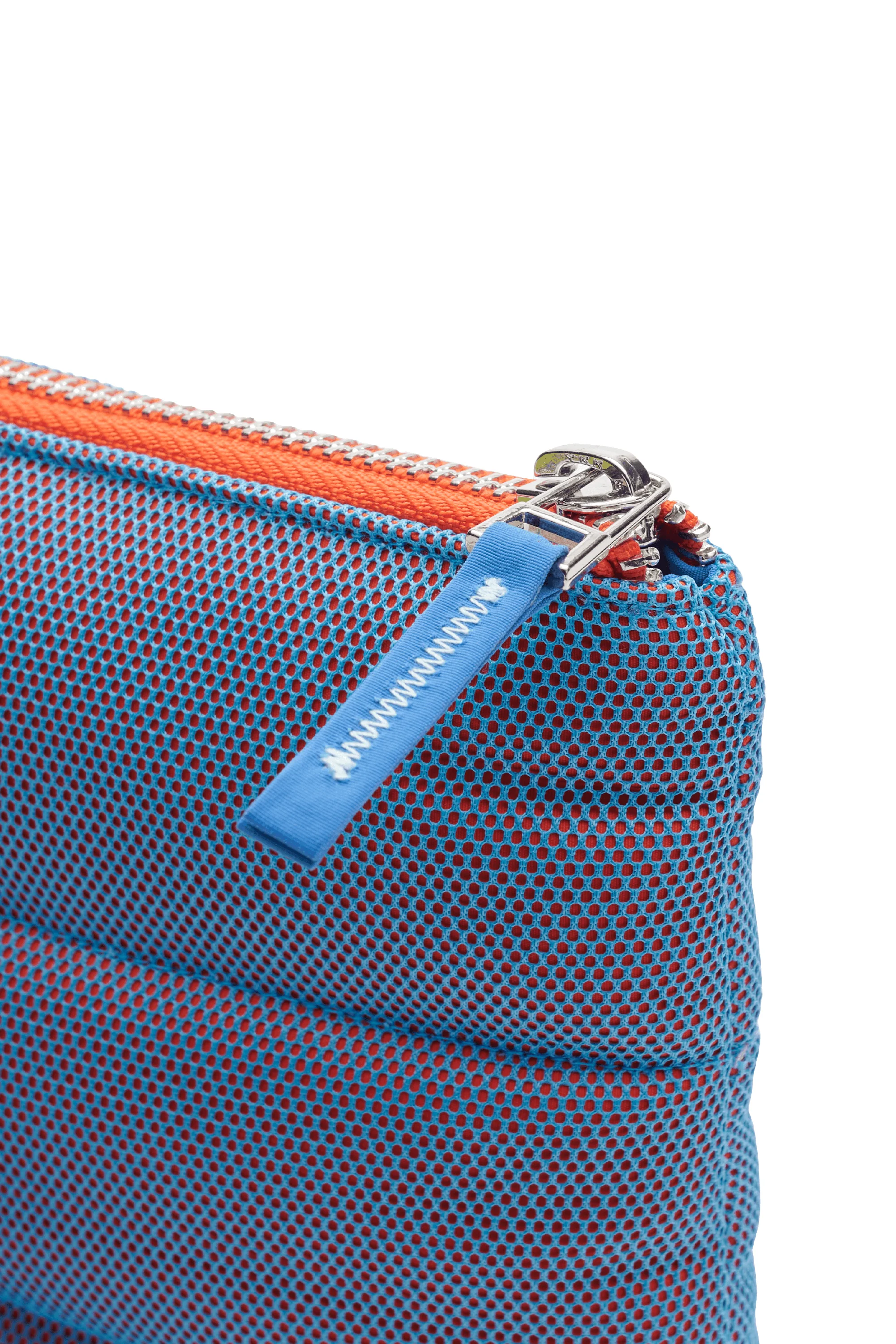 Made from water resistant nylon fabric layered with contrast mesh, this soft poofy pouch is designed with a rubber product label on the front and our brand mark at the side. It has a contrast engineer blue lining with a pocket, and is finished with an inner snap tab and a silver metal zipper.