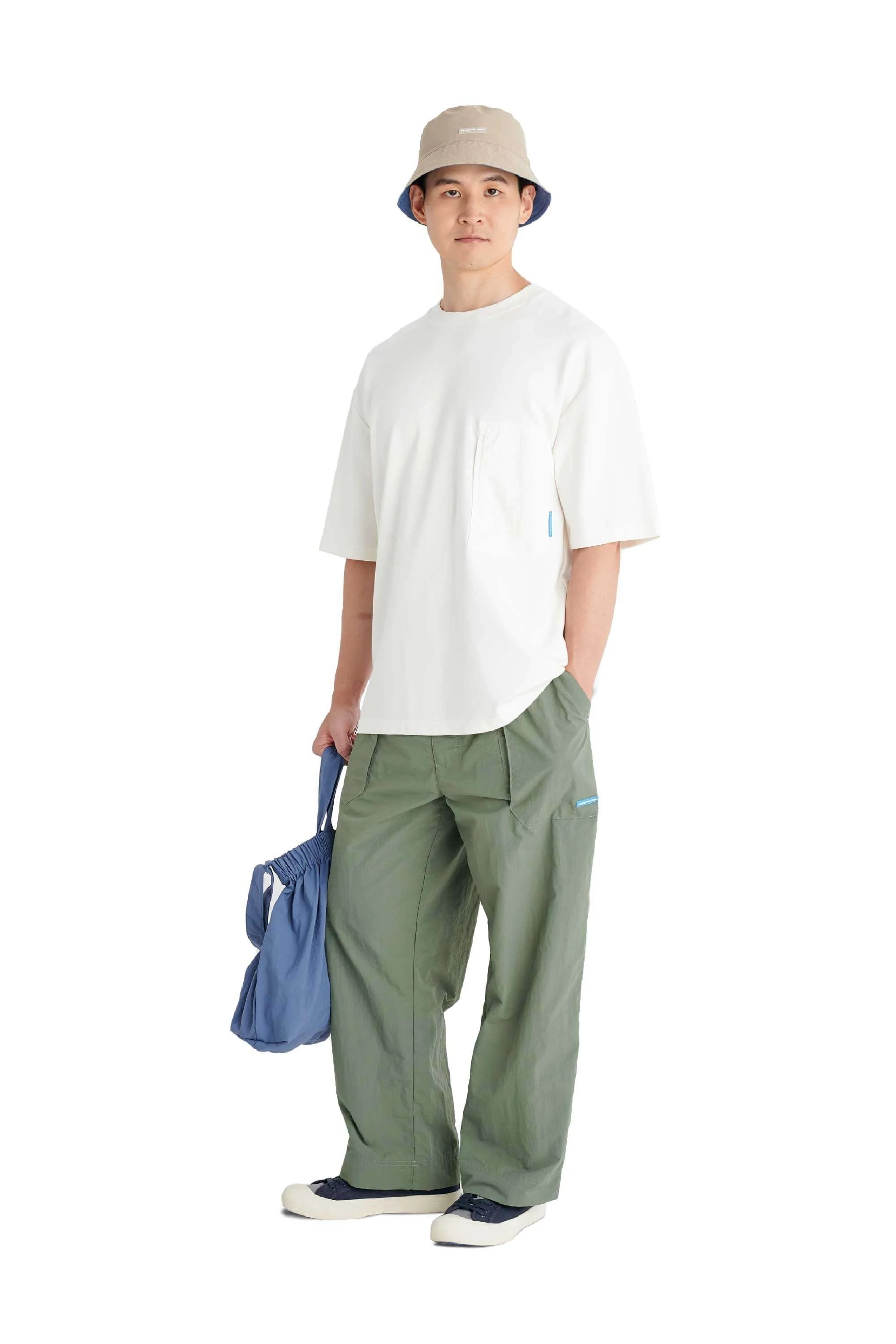 Made from ripstop nylon fabric, these trousers feature a relaxed silhouette, front gusset pockets and a contrast rubber label. Designed with a side welt pocket and a patch pocket with contrast bar tacks on the other side, it is finished with an elasticated waist, a snap button fly and an inner drawstring.