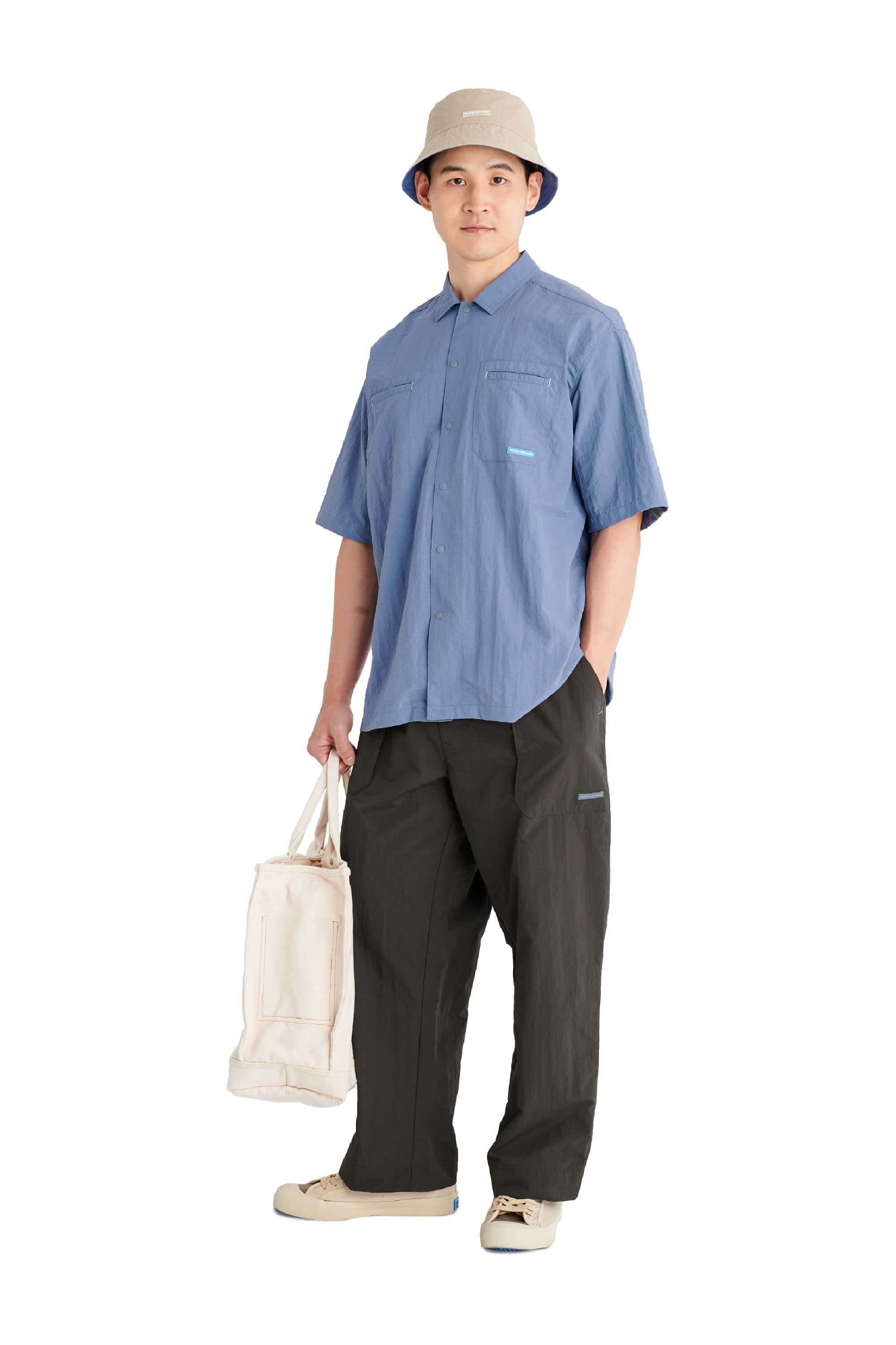 Made from textured nylon fabric, this utility short sleeve shirt features a boxy silhouette with snap buttons and a classic collar. It has front pockets with contrast stitching details and a contrast rubber label on the front. It is finished with a back yoke with our signature grosgrain detail.